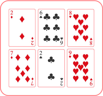 La couleur sera le cœur. On note que la troisième colonne correspond à la somme des deux premières. Il s’agit donc d’un neuf de cœur.