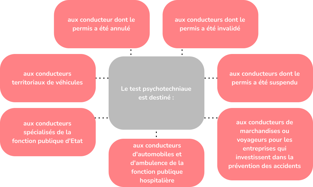 D’autres cas existent également pour amener au passage de tests psychotechniques du permis. Cela peut être demandé par des entreprises privées dans le cadre d’un recrutement ou d’un contrôle de santé de ses employés. Le secteur public a également dans ses processus l’habitude de demander la réalisation de ces tests. Exemple de métiers concernés : ambulancier, conducteur de bus, conducteur de train, conducteur RATP, etc.